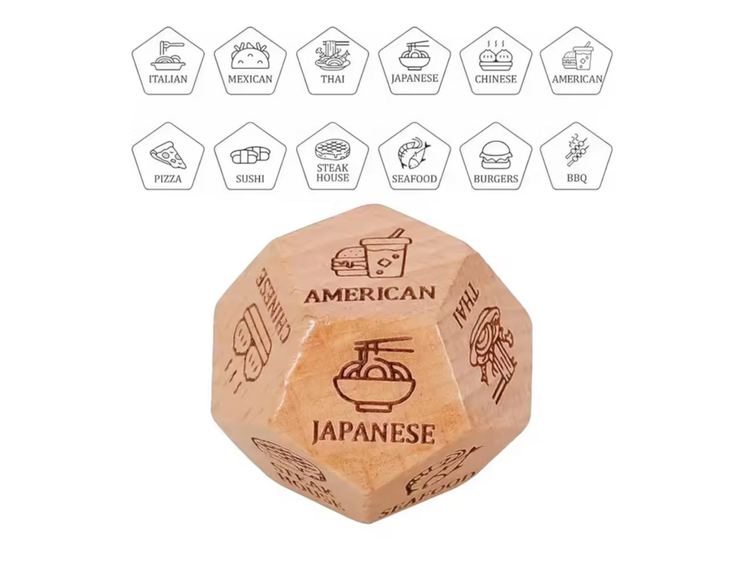 ¿Buscas una manera divertida de elegir restaurante? Con este dado de madera 12 caras ya no tendrás que discutir con tu pareja, amigos o familia sobre dónde ir a cenar. Lanza el dado y deja que la suerte decida por ti.